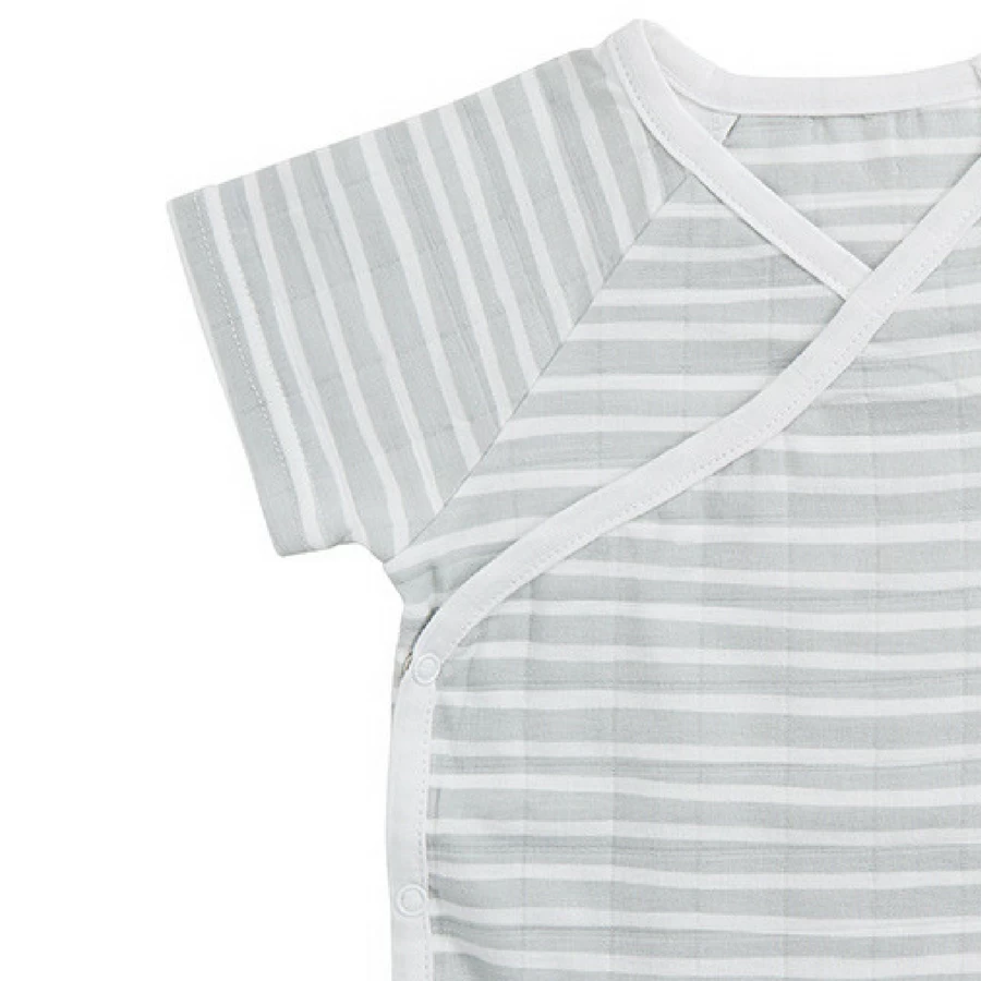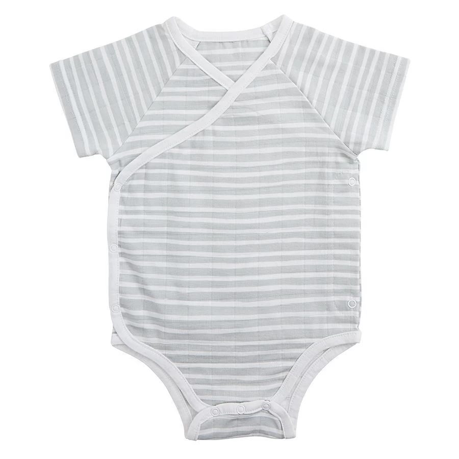 Plus, just like our other muslin products, our short sleeve kimono body suit stays soft wash after wash.