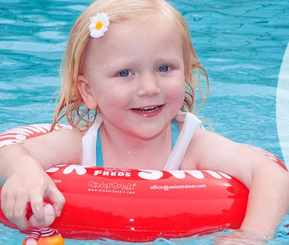 Our specially designed swimming aids are introduced according to the child’s age and learning ability (red, orange, yellow). The SWIMTRAINER “Classic” is used with babies to support their early development. Later our training technique should be applied for the child to achieve a perfect swimming style.