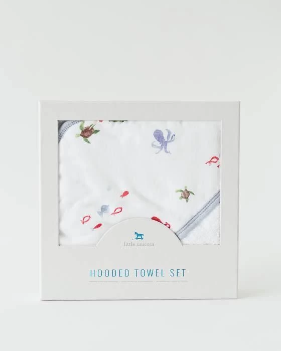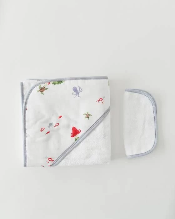Bath towel with printed cotton muslin on one side and ultra-soft terry cloth on the other; a cozy hood and pockets for little hands.