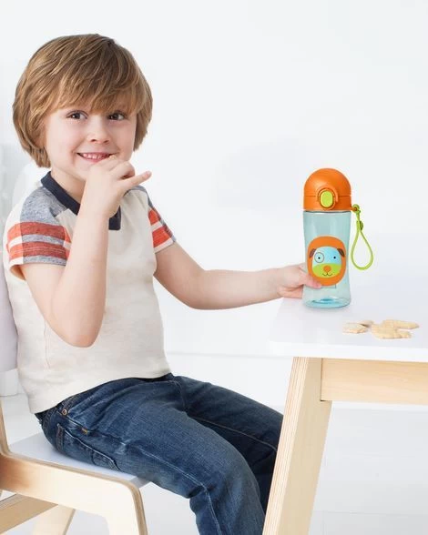 Perfectly sized for active bigger kids, this cute and convenient sports bottle features a locking lid to prevent spills, an easy-grip finger loop, a silicone drinking spout and a handy carrying strap for grab-and-go ease. The generous 14 oz. size holds plenty of water, juice or whatever your little ones likes to drink.