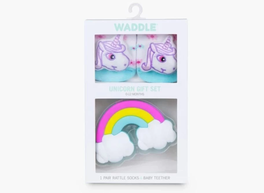 One Unicorn Baby Teether paired with our signature Unicorn rattle socks. This sets makes the perfect gift for a Baby girl or Baby Shower.